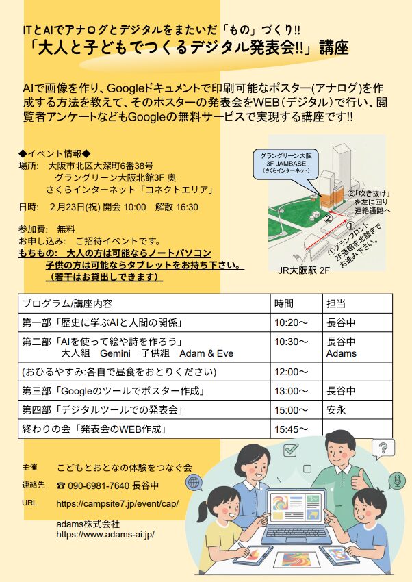 【親子で無料AI活用】 AIで画像を作り、Googleドキュメントで印刷可能なポスター(アナログ)を作成する方法を教えて、そのポスターの発表会をWEB(デジタル)で行い、閲覧者アンケートなどもGoogleの無料サービスで実現する親子講座です!!