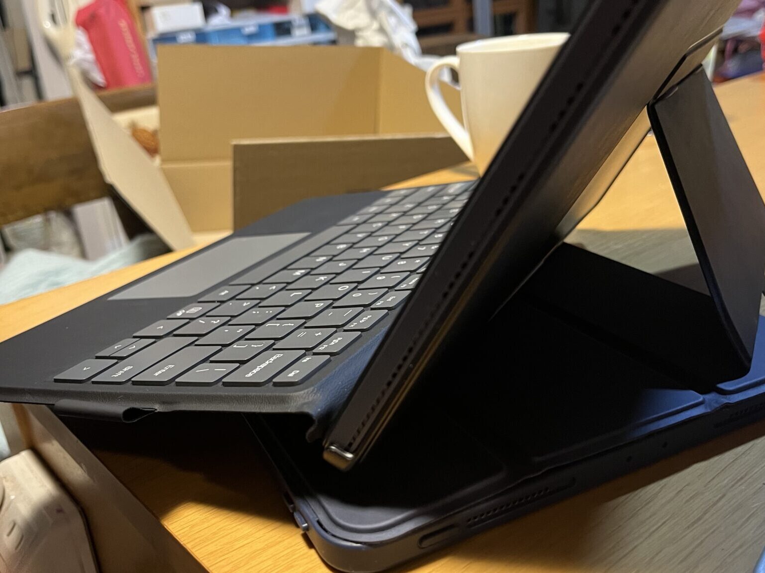 キーボードとパソコンはマグネット端子で「カチッ」とくっつくだけですので、キーボードをつけただけではモニターは立ちません上の写真のように「本体の標準カバー」にスタンドがついているのでこれで「立てる」形式なので立てる場所が必要です。