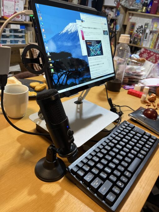 他はケンジントンのトラックボール(旧が安い)、USBハブ付きの小型キーボード、そして指向性マイク(+スタンドは交換)で環境を作っていますが、PC本体の音響設計が良いようで、外付けマイクはなくても音声は聞き取れるようですね。