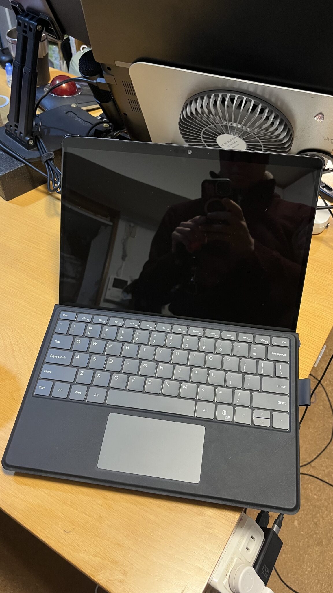 他はケンジントンのトラックボール(旧が安い)、USBハブ付きの小型キーボード、そして指向性マイク(+スタンドは交換)で環境を作っていますが、PC本体の音響設計が良いようで、外付けマイクはなくても音声は聞き取れるようですね。