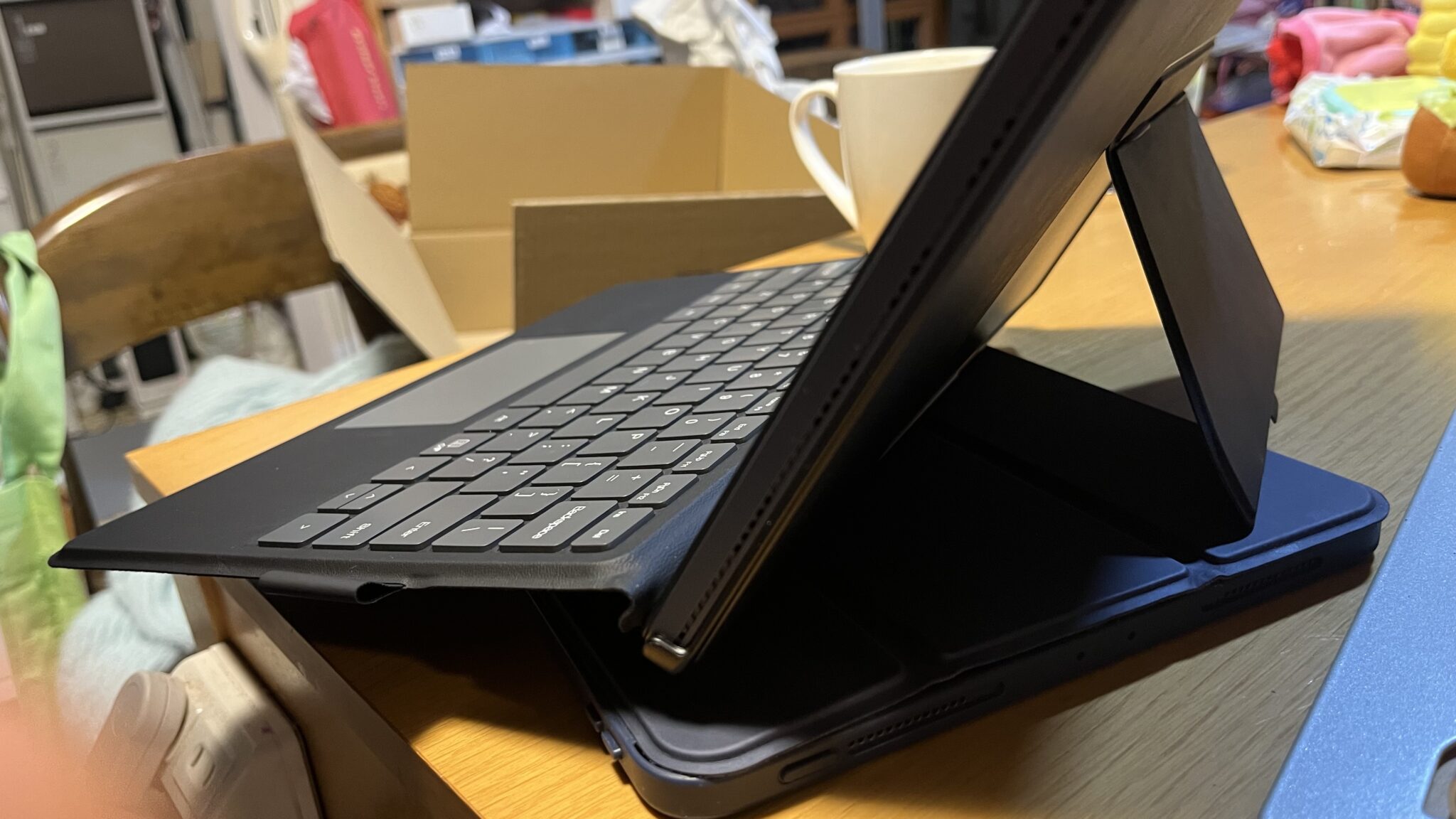 キーボードとパソコンはマグネット端子で「カチッ」とくっつくだけですので、キーボードをつけただけではモニターは立ちません上の写真のように「本体の標準カバー」にスタンドがついているのでこれで「立てる」形式なので立てる場所が必要です。